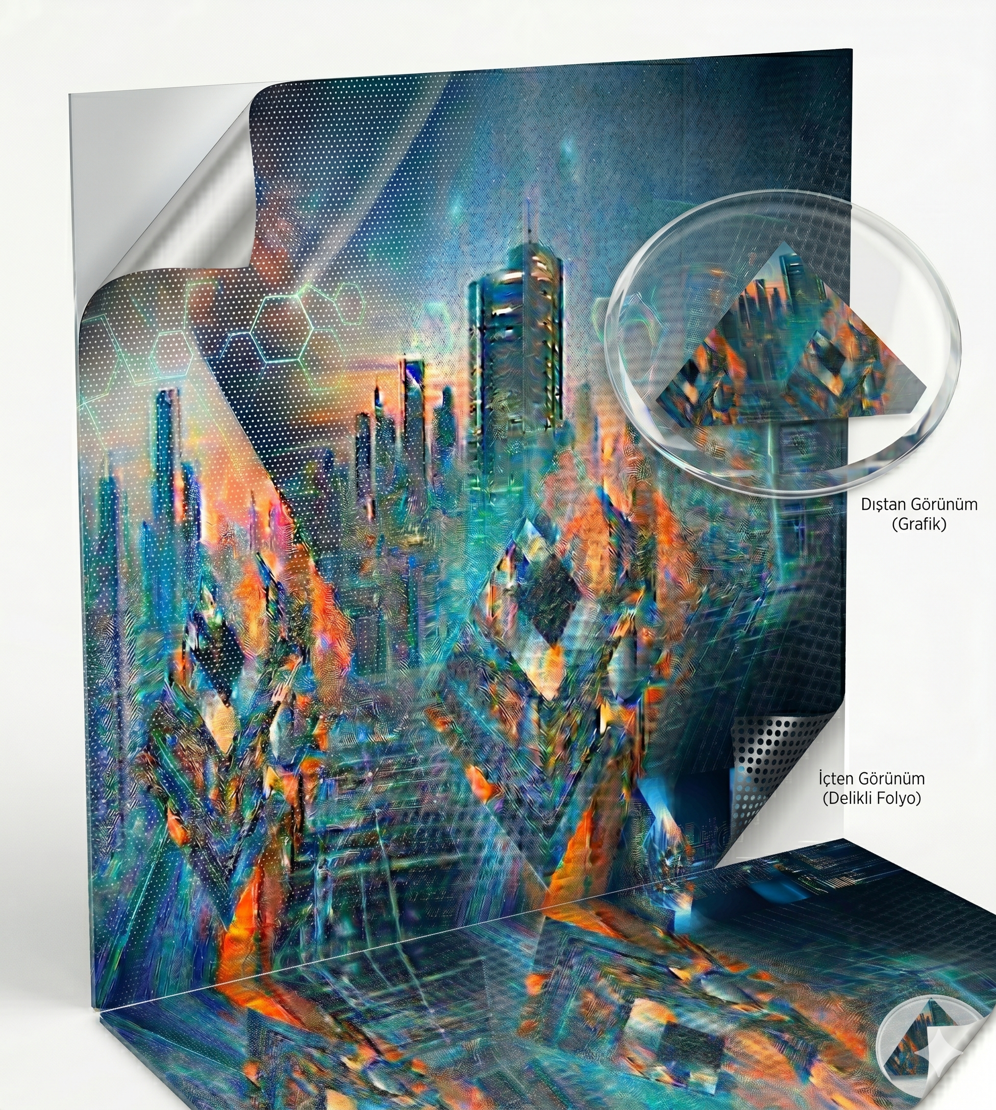 Halk arasında “delikli folyo” olarak da bilinir. Cam yüzeylere uygulandığında, dışarıdan bakıldığında içerisi görünmezken, içeriden dışarıyı net bir şekilde görme imkanı sağlar. Özellikle ofis camları ve araç kaplamalarında tercih edilir.